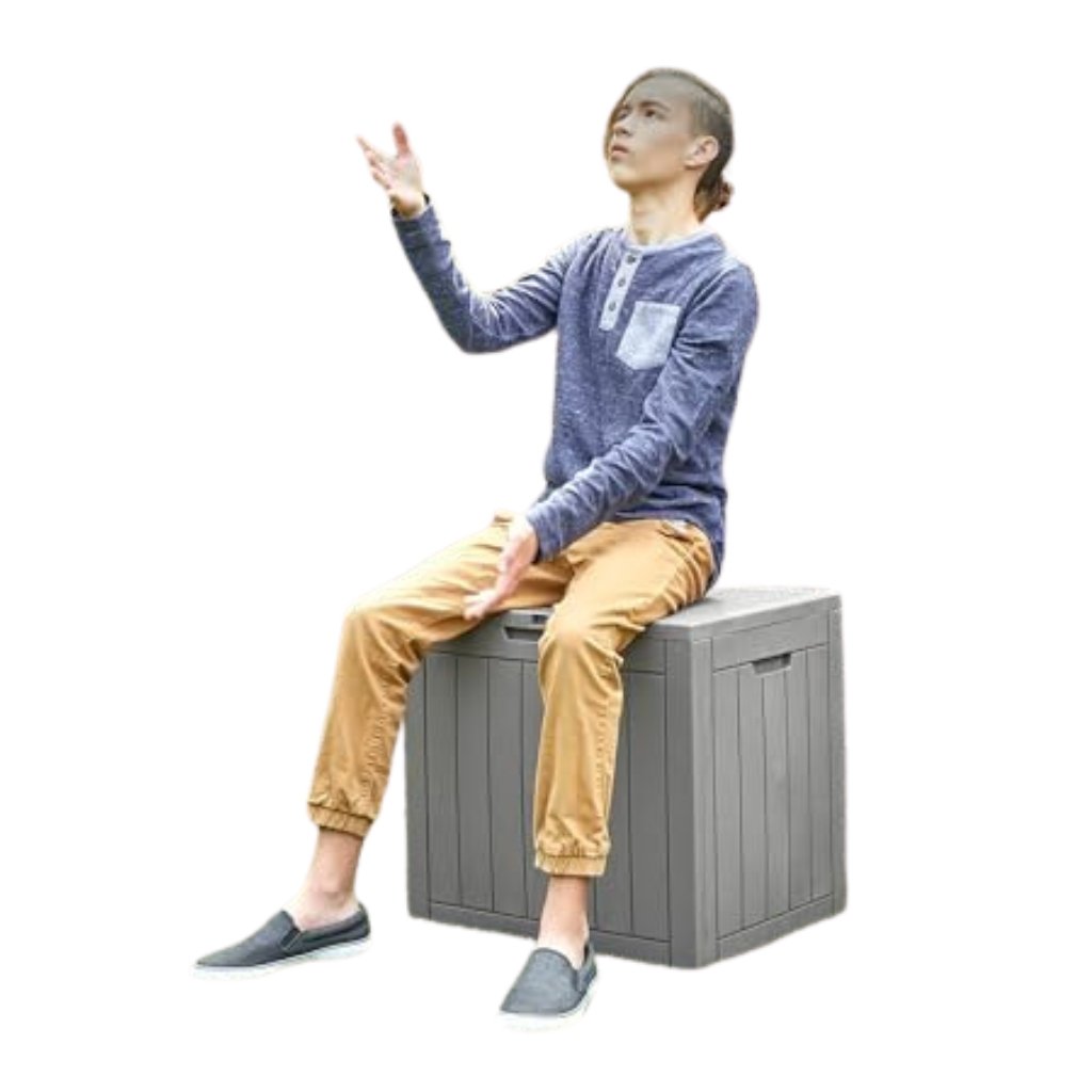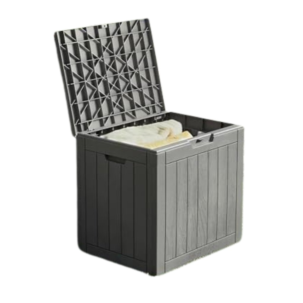 Outdoor storage bin designed for patios, porches, and garden organization.